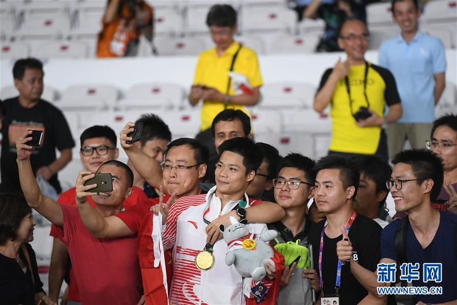 8月26日,中国选手苏炳添(中)在颁奖仪式后和观众合影。 当日,在第18届亚运会田径男子100米决赛中,中国选手苏炳添以9秒92的成绩获得冠军。 新华社记者岳月伟摄