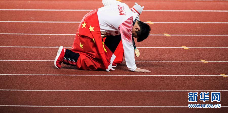 8月26日,中国选手苏炳添在颁奖仪式后。 当日,在第18届亚运会田径男子100米决赛中,中国选手苏炳添以9秒92的成绩获得冠军。 新华社记者吴壮摄