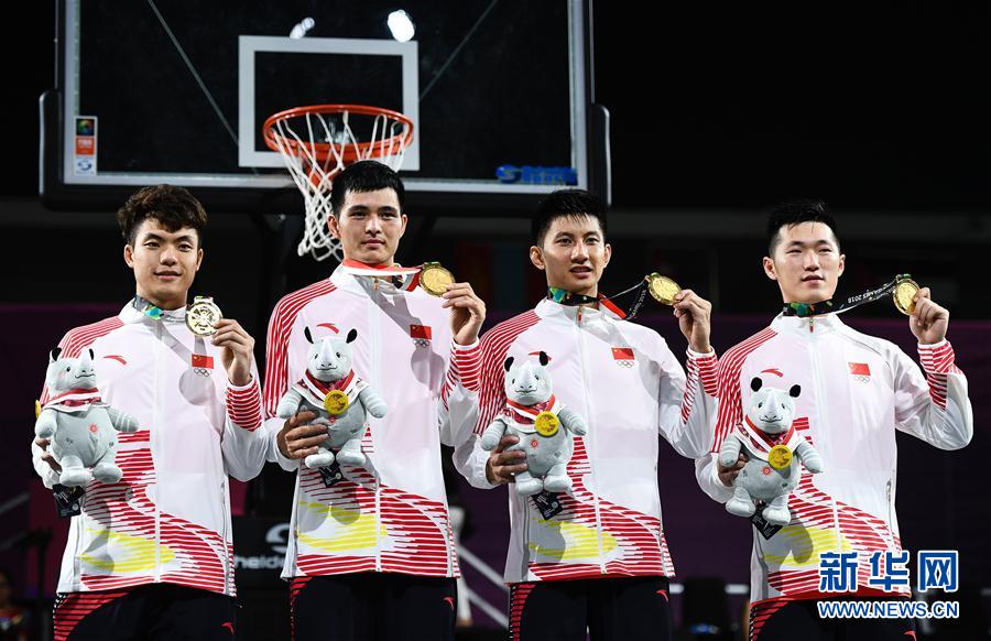 8月26日,中国队在颁奖仪式上。 当日,在第18届亚运会男子三人篮球决赛中,中国队以19比18战胜韩国队,获得冠军。 新华社记者李响摄