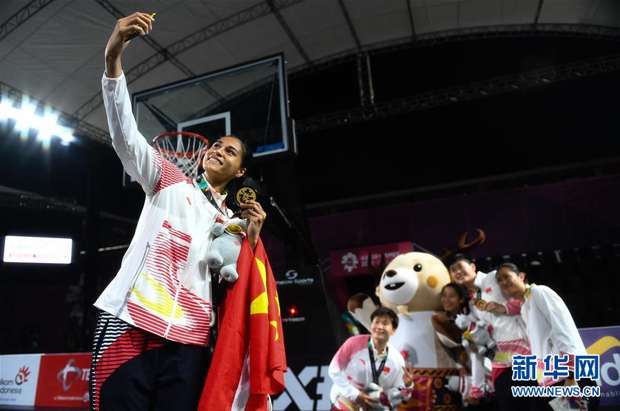 8月26日,中国队球员迪拉娜·迪里夏提(左一)在颁奖仪式后和队友合影。 当日,在第18届亚运会女子三人篮球决赛中,中国队以21比10战胜日本队,获得冠军。 新华社记者李响摄