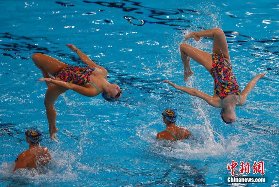 8月26日,雅加达亚运会花样游泳项目开赛在即,各参赛队在赛场训练适应场地。图为哈萨克斯坦队在训练。中新社记者 杜洋 摄
