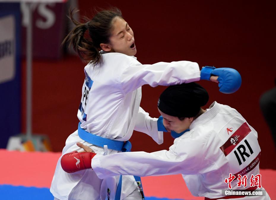 8月26日,雅加达亚运会空手道女子55公斤以下级决赛,中国台北选手文姿云(左)战胜伊朗选手夺得冠军。中新社记者 侯宇 摄