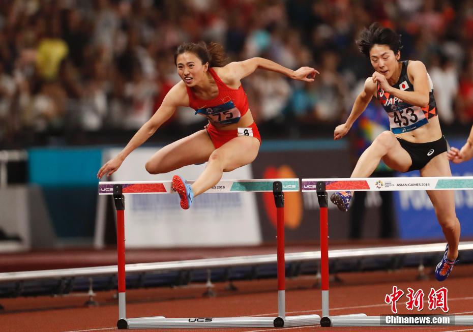 8月26日,2018年雅加达亚运会田径比赛,女子100米栏决赛,韩国选手郑惠林以13秒20夺得冠军。印尼选手诺瓦以13秒33夺得亚军,中国香港选手摘得季军,中国选手王逗以13秒50排名第四。中新社记者 杜洋 摄