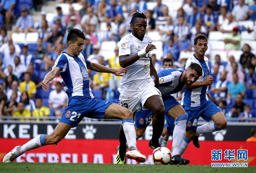 8月26日,西班牙人队球员洛卡(左一)与巴伦西亚队球员巴舒亚伊(左二)在比赛中拼抢。 当日,在2018-2019赛季西班牙足球甲级联赛第二轮比赛中,西班牙人队主场以2比0战胜巴伦西亚队。 新华社发(胡安·戈萨摄)