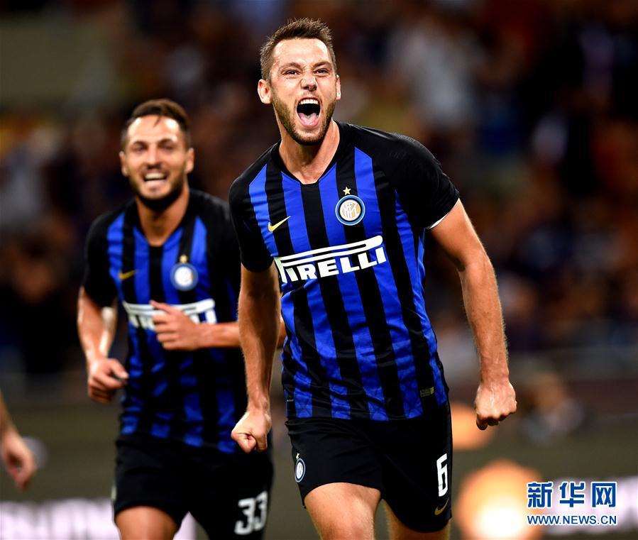 8月26日,国际米兰队球员德弗里伊在进球后庆祝。 当日,在2018-2019赛季意大利足球甲级联赛第二轮比赛中,国际米兰队主场以2比2战平都灵队。 新华社发(阿尔贝托·林格里亚摄)