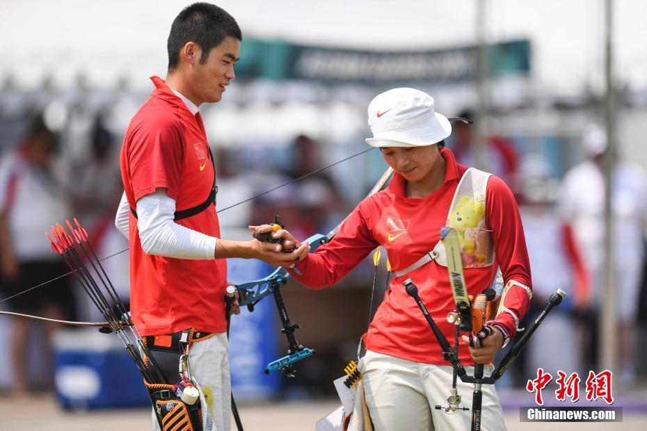 8月27日,雅加达亚运会射箭混合团体反曲弓铜牌赛中,中国队选手徐天宇与张心妍的组合以6比2战胜蒙古队摘得铜牌。中新社记者 杨华峰 摄
