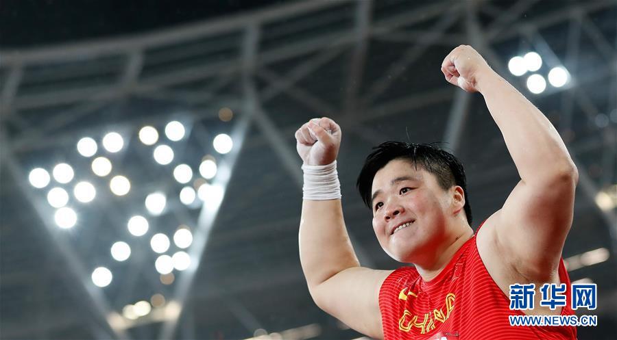 ↑图为2017年8月9日,中国选手巩立姣在田径世锦赛女子铅球决赛后庆祝夺冠。 新华社记者王丽莉摄