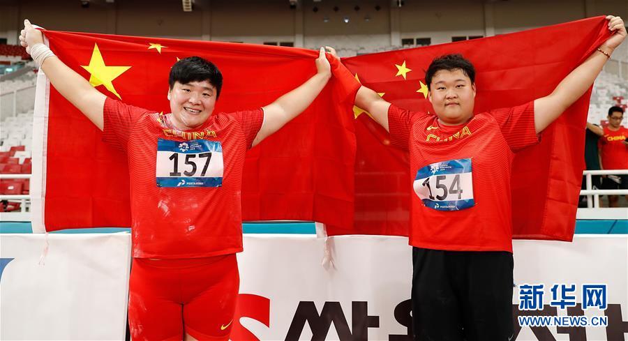 ↑ 图为2018年8月26日,巩立姣(左)、高阳在雅加达亚运会女子铅球决赛后庆祝。 新华社记者王丽莉摄
