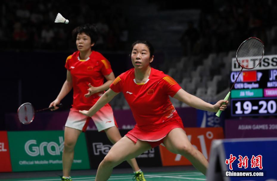 8月27日,2018年雅加达亚运会羽毛球女双比赛落幕,陈清晨/贾一凡夺取金牌。在女双决赛面对奥运冠军松友美佐纪/高桥礼华,陈清晨/贾一凡表现不俗以两个22比20拿下夺取冠军。中新社记者 杜洋 摄