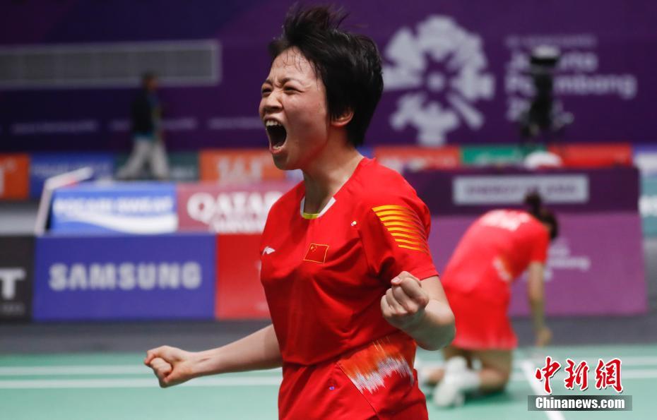 8月27日,2018年雅加达亚运会羽毛球女双比赛落幕,陈清晨/贾一凡夺取金牌。在女双决赛面对奥运冠军松友美佐纪/高桥礼华,陈清晨/贾一凡表现不俗以两个22比20拿下夺取冠军。中新社记者 杜洋 摄