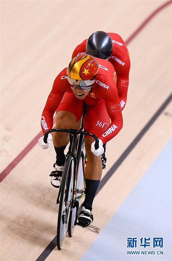 8月27日,中国队选手徐超(前)在比赛中冲刺。 当日,在第18届亚运会场地自行车男子团体竞速决赛中,中国队以44秒160的成绩夺冠。 新华社记者李响摄