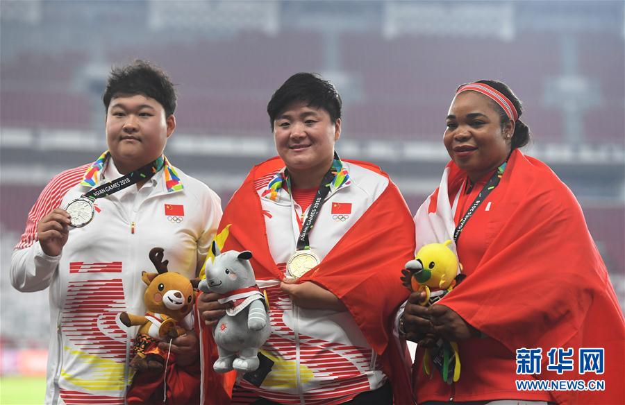 8月27日,冠军中国选手巩立姣(中)、亚军中国选手高阳(左)和季军巴林选手贾西姆在颁奖仪式上。 当日,在第18届亚运会田径女子铅球决赛中,中国选手巩立姣以19米66的成绩夺冠,中国选手高阳获得亚军,巴林选手贾西姆获得季军。 新华社记者岳月伟摄