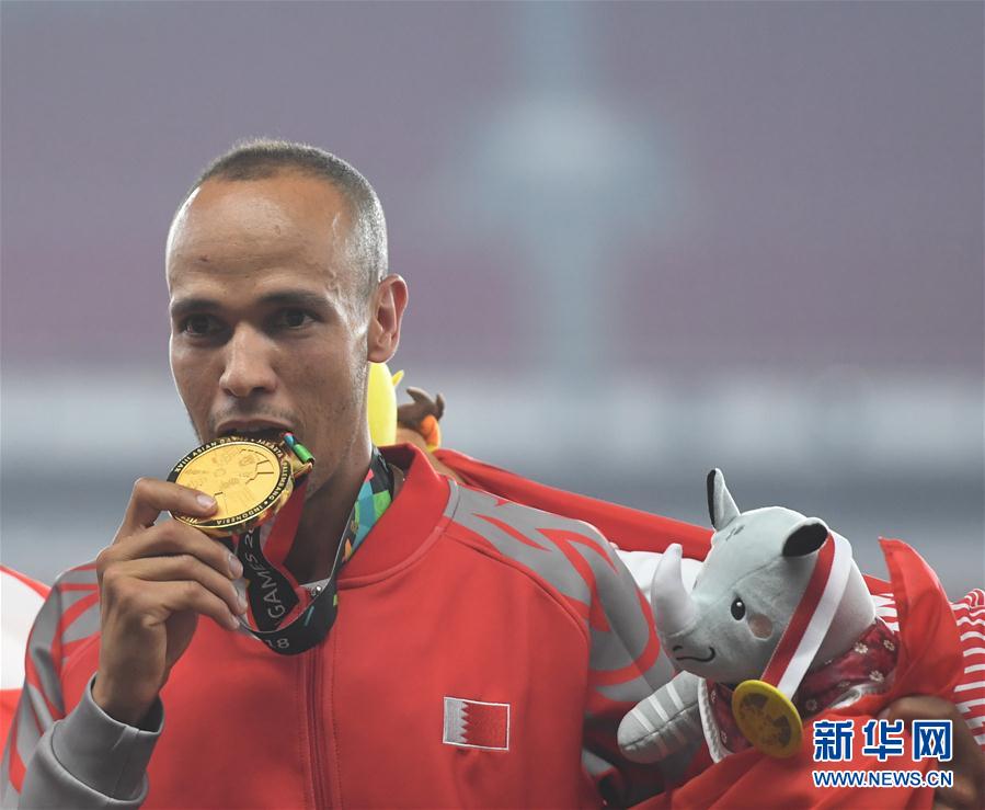8月27日,冠军巴林选手查尼在颁奖仪式上。 当日,在第18届亚运会田径男子10000米决赛中,巴林选手查尼以28分35秒54的成绩获得冠军,巴林选手亚伯拉罕获得亚军,中国选手赵长虹获得季军。 新华社记者岳月伟摄