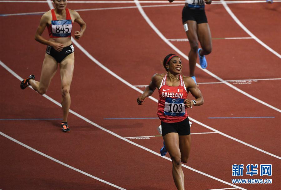 8月27日,巴林选手奥卢瓦凯米(前)冲过终点线。 当日,在第18届亚运会田径女子400米栏决赛中,巴林选手奥卢瓦凯米以54秒48的成绩夺冠。 新华社记者杜宇摄