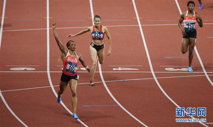 8月27日,巴林选手奥卢瓦凯米(左)冲过终点线。 当日,在第18届亚运会田径女子400米栏决赛中,巴林选手奥卢瓦凯米以54秒48的成绩夺冠。 新华社记者杜宇摄