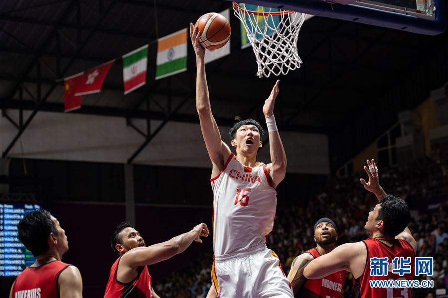 8月27日,中国队球员周琦(上)在比赛中上篮。 当日,在第18届亚运会男子篮球四分之一决赛中,中国队以98比63战胜印度尼西亚队。 新华社记者张金加摄