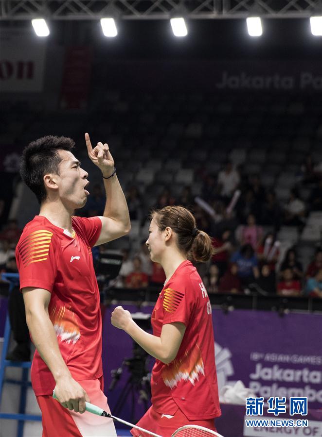8月27日,中国选手郑思维(左)/黄雅琼庆祝胜利。 当日,在第18届亚运会羽毛球混双决赛中,中国选手郑思维/黄雅琼以2比0战胜中国香港选手邓俊文/谢影雪,获得冠军。 新华社记者费茂华摄