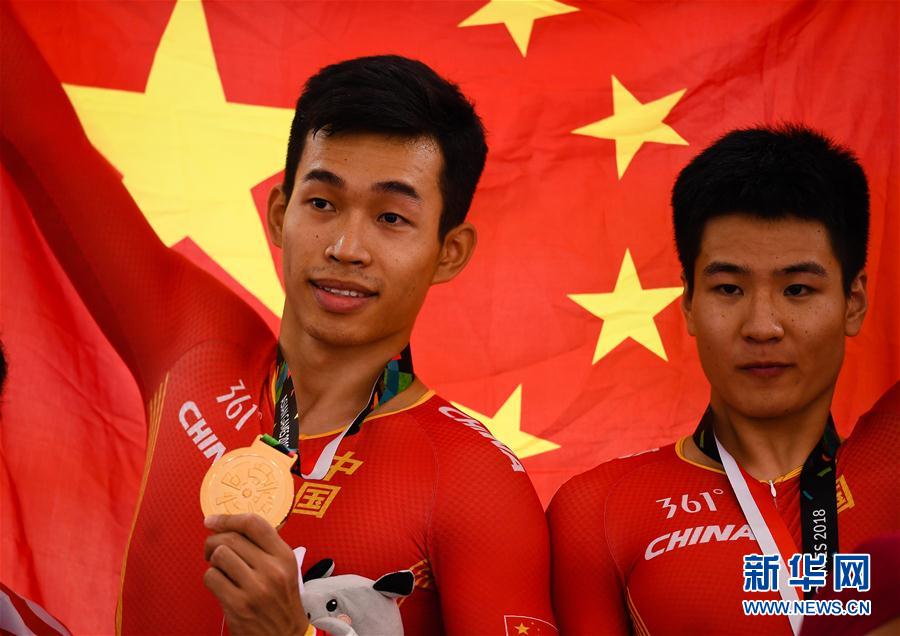 8月27日,中国队选手徐超(左)、周瑜在颁奖仪式上庆祝。 当日,在第18届亚运会场地自行车男子团体竞速决赛中,中国队以44秒160的成绩夺冠。 新华社记者李响摄