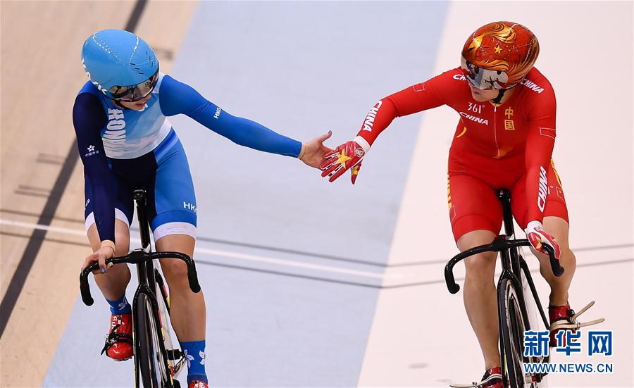 8月27日,中国队选手林俊红(右)在比赛后与中国香港选手马咏茹击掌拉手。 当日,在第18届亚运会场地自行车女子团体竞速决赛中,中国队击败中国香港队,夺得冠军。 新华社记者李响摄