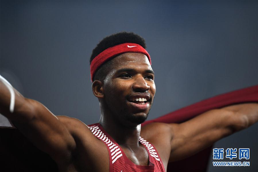 8月27日,卡塔尔选手桑巴在比赛后庆祝。 当日,在第18届亚运会田径男子400米栏决赛中,卡塔尔选手桑巴以47秒66的成绩获得冠军。 新华社记者岳月伟摄