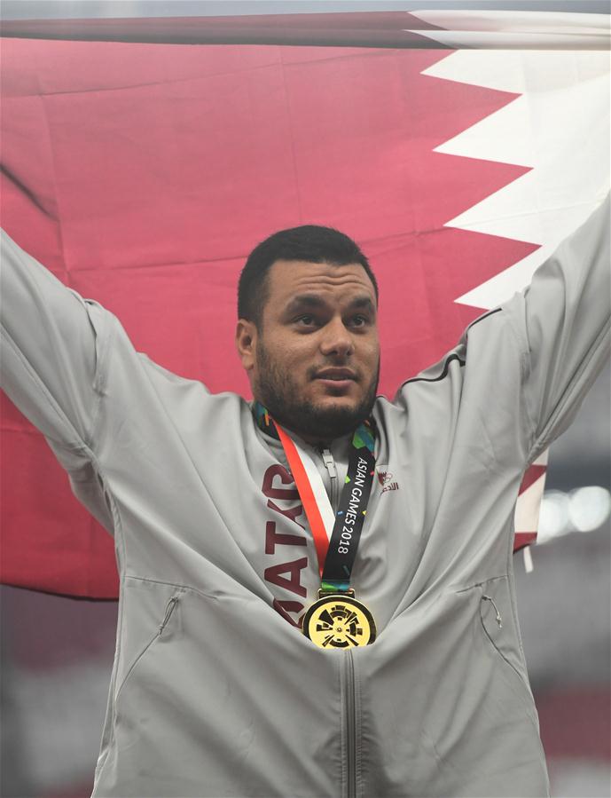 8月27日,冠军卡塔尔选手阿什拉夫在颁奖仪式上。 当日,第18届亚运会田径男子链球颁奖仪式在雅加达举行。 新华社记者岳月伟摄