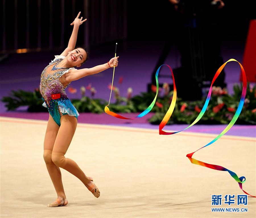 8月27日,中国选手康琦在比赛中 当日,第18届亚运会艺术体操个人全能资格赛在雅加达举行。 新华社记者王毓国摄