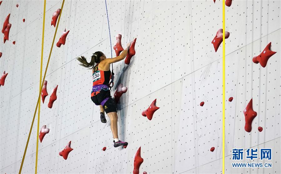 8月27日,获得亚军的中国队队员潘旭华在比赛中。 当日,在第18届亚运会攀岩女子速度接力决赛中,中国两支队伍分获亚军和季军。 新华社记者程敏摄