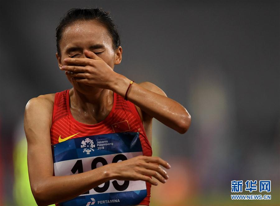 8月27日,中国选手许双双在比赛后。 当日,在第18届亚运会田径女子3000米障碍赛中,中国选手许双双获得第五名。 新华社记者岳月伟摄
