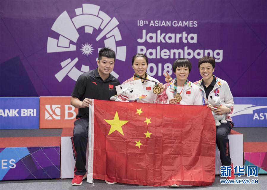 8月27日,冠军中国选手陈清晨(右二)/贾一凡(左二)在颁奖仪式后和教练合影。 当日,第18届亚运会羽毛球女子双打颁奖仪式在雅加达举行。 新华社记者费茂华摄