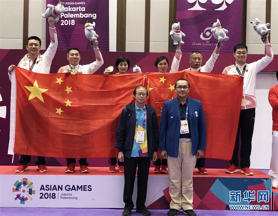 8月27日,冠军中国队在颁奖仪式上。 当日,第18届亚运会桥牌超级混合团体颁奖仪式在雅加达举行。 新华社记者仇博摄