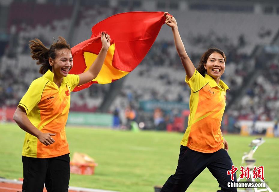 8月27日晚,亚运会女子跳远比赛,越南选手BUI THI THU THAO(右)夺冠。中新社记者 王东明 摄