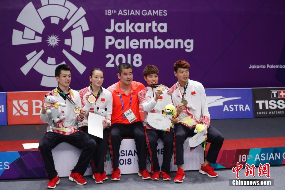 8月27日晚,第18届亚运会羽毛球混双决赛,现世界排名第一的中国组合郑思维/黄雅琼大比分2-0(21-8、21-15)战胜中国香港组合邓俊文/谢影雪,夺得亚运混双冠军。王懿律/黄东萍组合获得铜牌。中新社记者 杜洋 摄