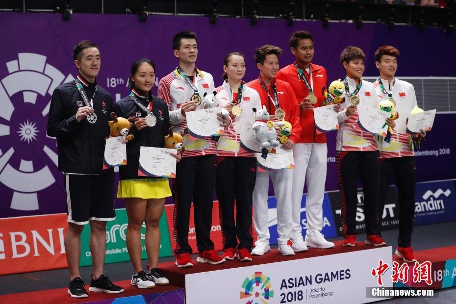 8月27日晚,第18届亚运会羽毛球混双决赛,现世界排名第一的中国组合郑思维/黄雅琼大比分2-0(21-8、21-15)战胜中国香港组合邓俊文/谢影雪,夺得亚运混双冠军。王懿律/黄东萍组合获得铜牌。中新社记者 杜洋 摄