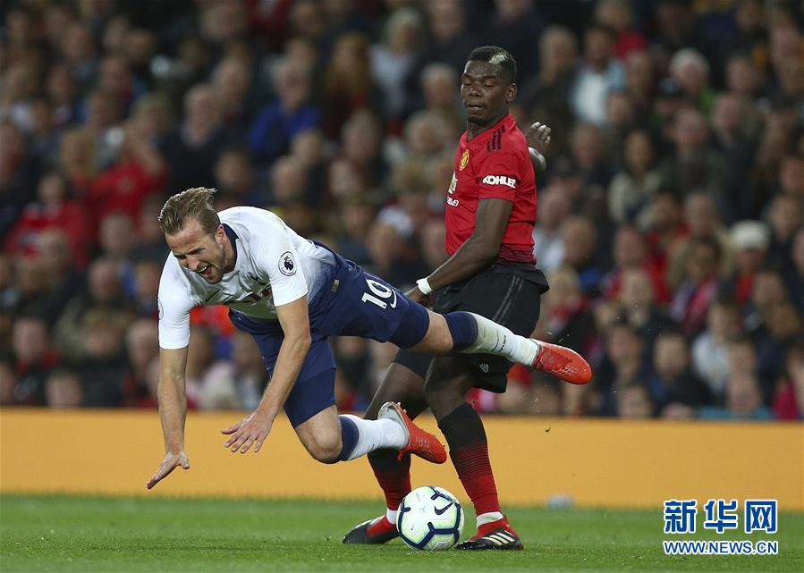 8月27日,热刺队球员哈里·凯恩(左)与曼联队球员博格巴在比赛中拼抢。 当日,在2018-2019赛季英格兰足球超级联赛第三轮比赛中,热刺队客场以3比0战胜曼联队。 新华社/美联