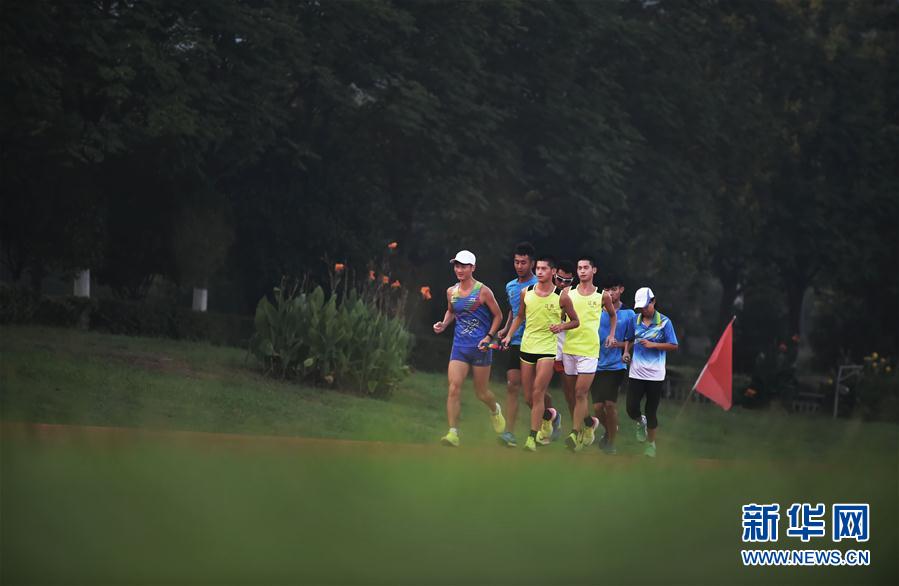 图为清晨五点半,双胞胎兄弟和他们的队友在田径场上晨练(8月16日摄)。 新华社记者李雨泽摄
