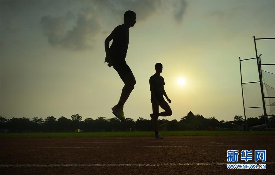 图为兄弟二人在田径场上热身(8月15日摄)。 新华社记者李雨泽摄