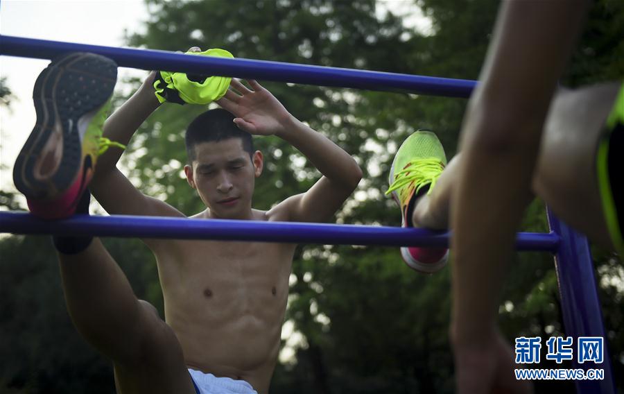图为兄弟二人晨练之后在田径场上做拉伸动作(8月16日摄)。 新华社记者李雨泽摄