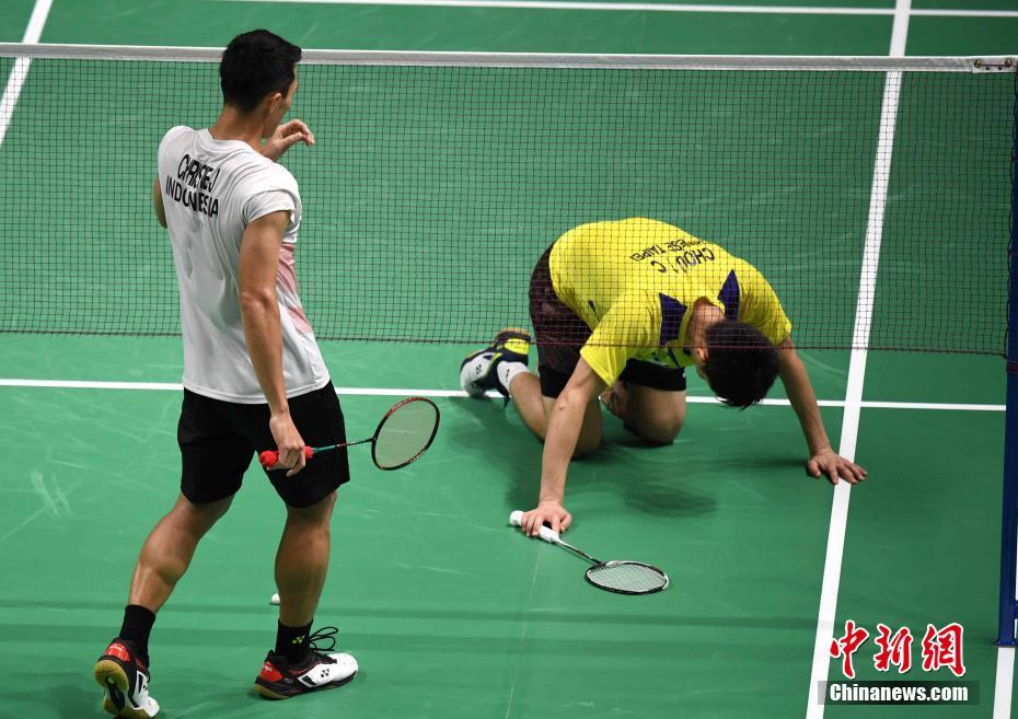 8月28日,雅加达亚运会羽毛球赛场展开男单冠军争夺战,东道主选手乔纳坦与中国台北的周天成展开较量,双方拼满了三局,最终乔纳坦以2-1胜出,首次夺得亚运男单桂冠,同时帮助印尼在时隔12年后再夺亚运会男单金牌,周天成获得银牌,这是中国台北男单在亚运会历史上的最好成绩。图为双方队员在比赛中。中新社记者 王东明 摄