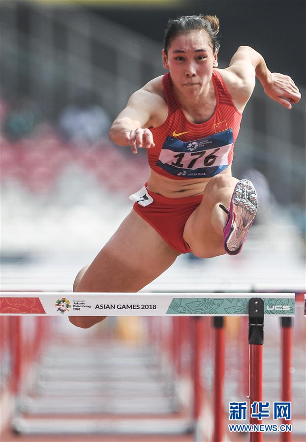 ↑8月28日,中国选手王庆铃在100米栏比赛中。当日,第18届亚运会女子七项全能比赛在雅加达举行。新华社记者潘昱龙摄