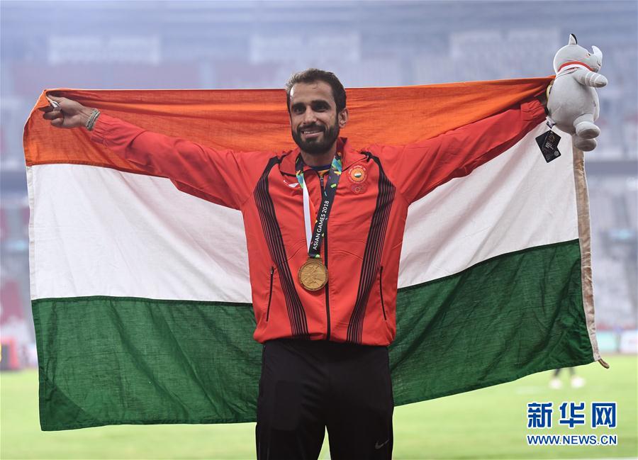 8月28日,冠军印度选手曼吉特在颁奖仪式上。 当日,在第18届亚运会男子800米决赛中,印度选手曼吉特以1分46秒15的成绩获得冠军。 新华社记者潘昱龙摄