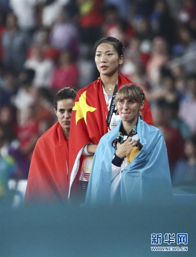 8月28日,冠军中国选手王春雨(中)在颁奖仪式上。 当日,第18届亚运会田径女子800米颁奖仪式在雅加达举行。 新华社记者兰红光摄