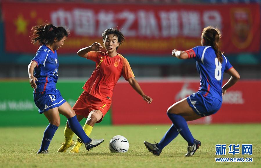 8月28日,中国队球员王霜(中)在比赛中带球突破。 当日,在第18届亚运会女足半决赛中,中国队以1比0战胜中国台北队,晋级决赛。 新华社发(刘艾伦摄)