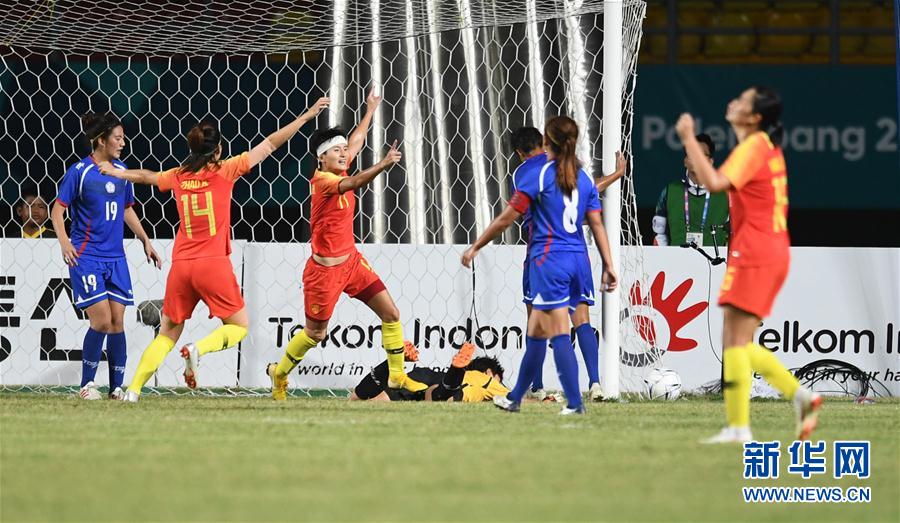 8月28日,中国队球员王珊珊(左三)在进球后庆祝。 当日,在第18届亚运会女足半决赛中,中国队以1比0战胜中国台北队,晋级决赛。 新华社发(刘艾伦摄)