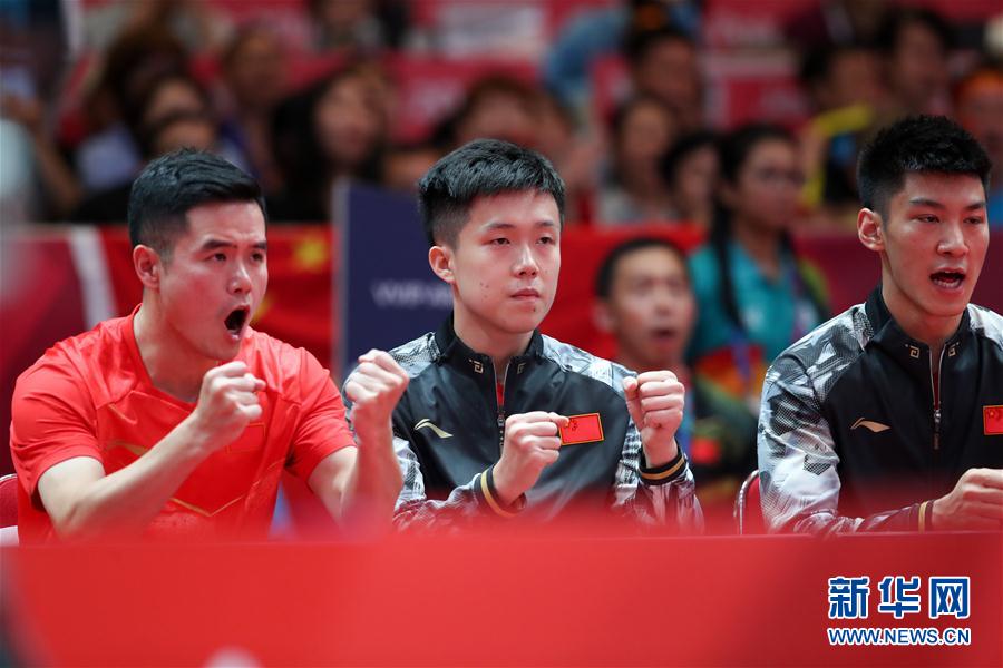 8月28日,中国队球员在场边加油。 当日,在第18届亚运会乒乓球男子团体决赛中,中国队以3比0战胜韩国队,获得冠军。 新华社记者丁汀摄
