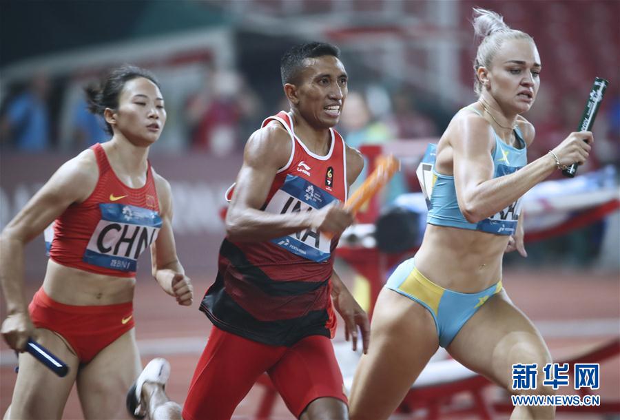 8月28日,参赛选手在比赛中。 当日,在第18届亚运会田径男女混合4X400米接力比赛在雅加达举行。 新华社记者兰红光摄