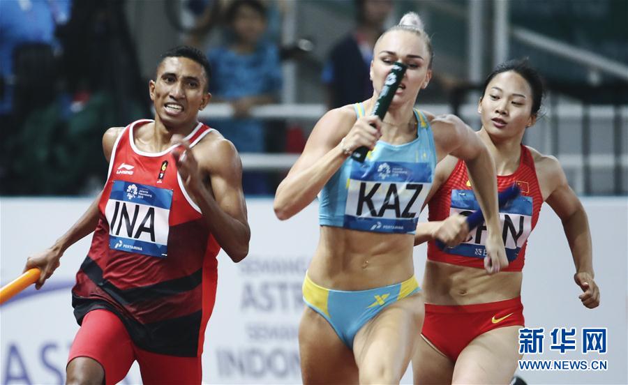 8月28日,参赛选手在比赛中。 当日,第18届亚运会田径男女混合4X400米接力比赛在雅加达举行。 新华社记者兰红光摄