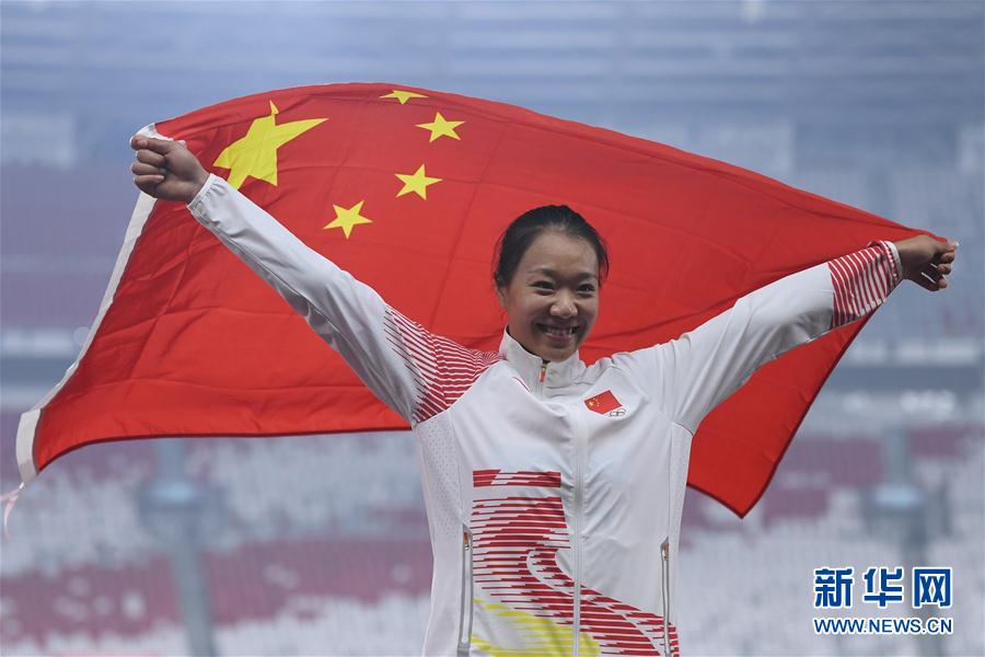 8月28日,冠军中国选手刘诗颖在颁奖仪式上。 当日,第18届亚运会田径女子标枪颁奖仪式在雅加达举行。 新华社记者潘昱龙摄