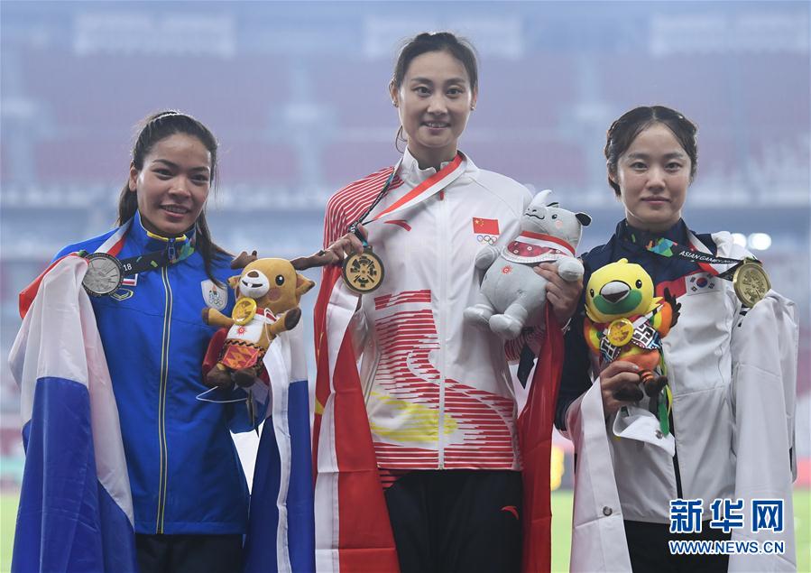 8月28日,冠军中国选手李玲(中)在颁奖仪式上。 当日,第18届亚运会田径女子撑杆跳高颁奖仪式在雅加达举行。 新华社记者潘昱龙摄