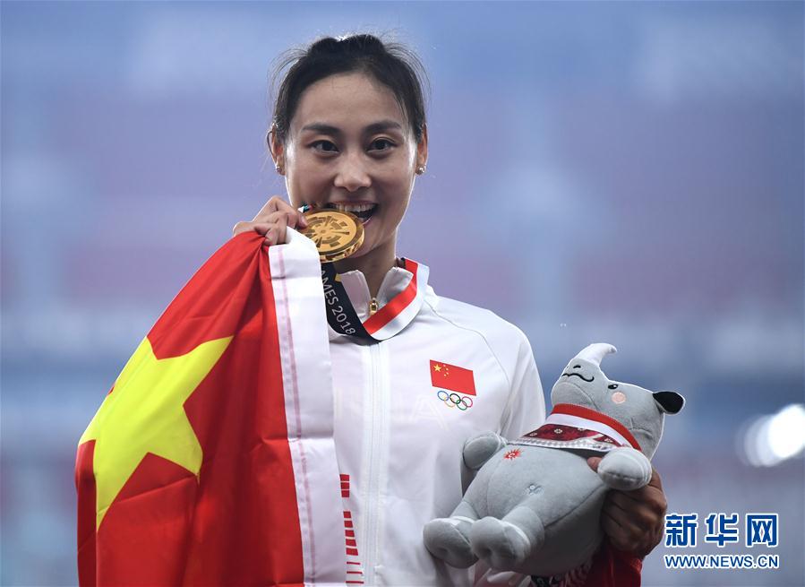 8月28日,冠军中国选手李玲在颁奖仪式上。 当日,第18届亚运会田径女子撑杆跳高颁奖仪式在雅加达举行。 新华社记者潘昱龙摄