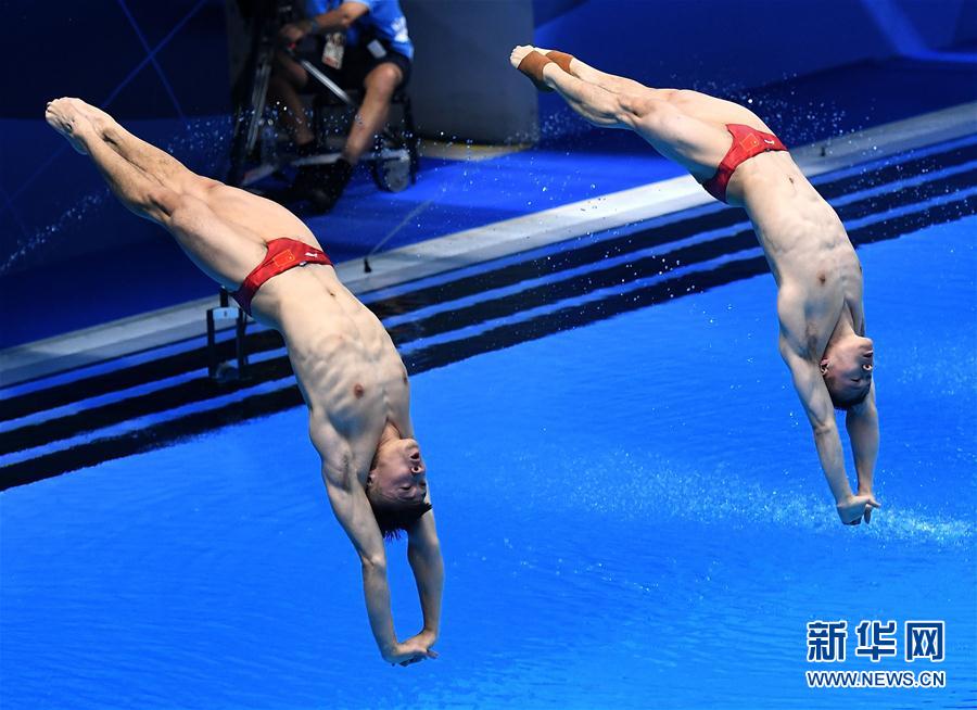 8月28日,中国选手曹缘/谢思埸在比赛中。 当日,在第18届亚运会跳水男子双人3米跳板决赛中,中国选手曹缘/谢思埸以479.52分的成绩夺冠。 新华社记者岳月伟摄
